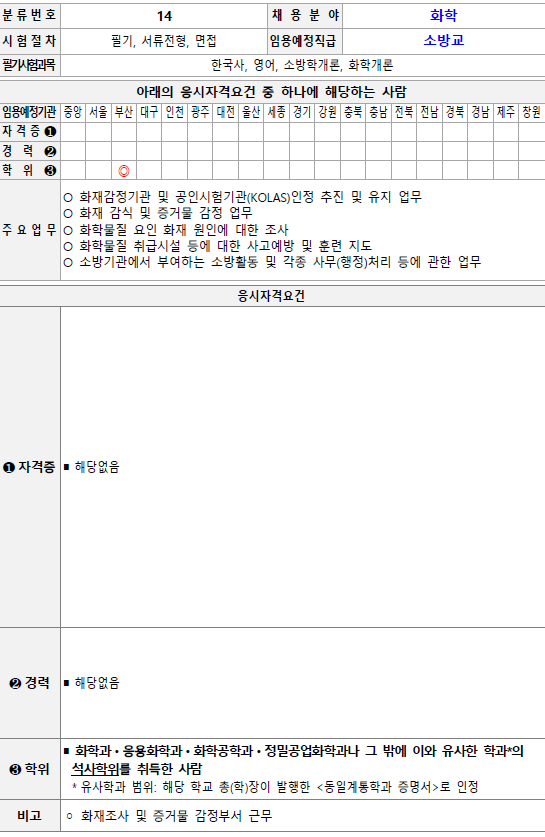 아래는 '화학' 분야 소방교 경력채용 자격요건이니 참고하세요.