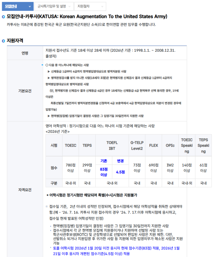 모집안내 - 카투사 - 육군 - 안내 및 지원절차 - 모집안내서비스 - 군지원 안내 - 병무청병역이행안내 군지원(입영신청)안내 국민참여마당(집단지성) 병무소식 병무청소개 > 군지원 안내 > 모집안내서비스 > 안내 및 지원절차 > 육군 > 카투사 > 모집안내 모집안내 육군 해군 해병대 공군 기술행정병 취업맞춤특기병 임기제부사관 전문특기병 어학병 카투사 동반입대병 직계가족복무부대병 연고지복무병 기술행정병(연단위모집) 모집안내 군사특기임무 및 설명 지원절차 모집안내-카투사(KATUSA: Korean Augmentation To the United States Army) 카투사는 미8군에 증강된 한국군 육군 요원(한국군지원단 소속...